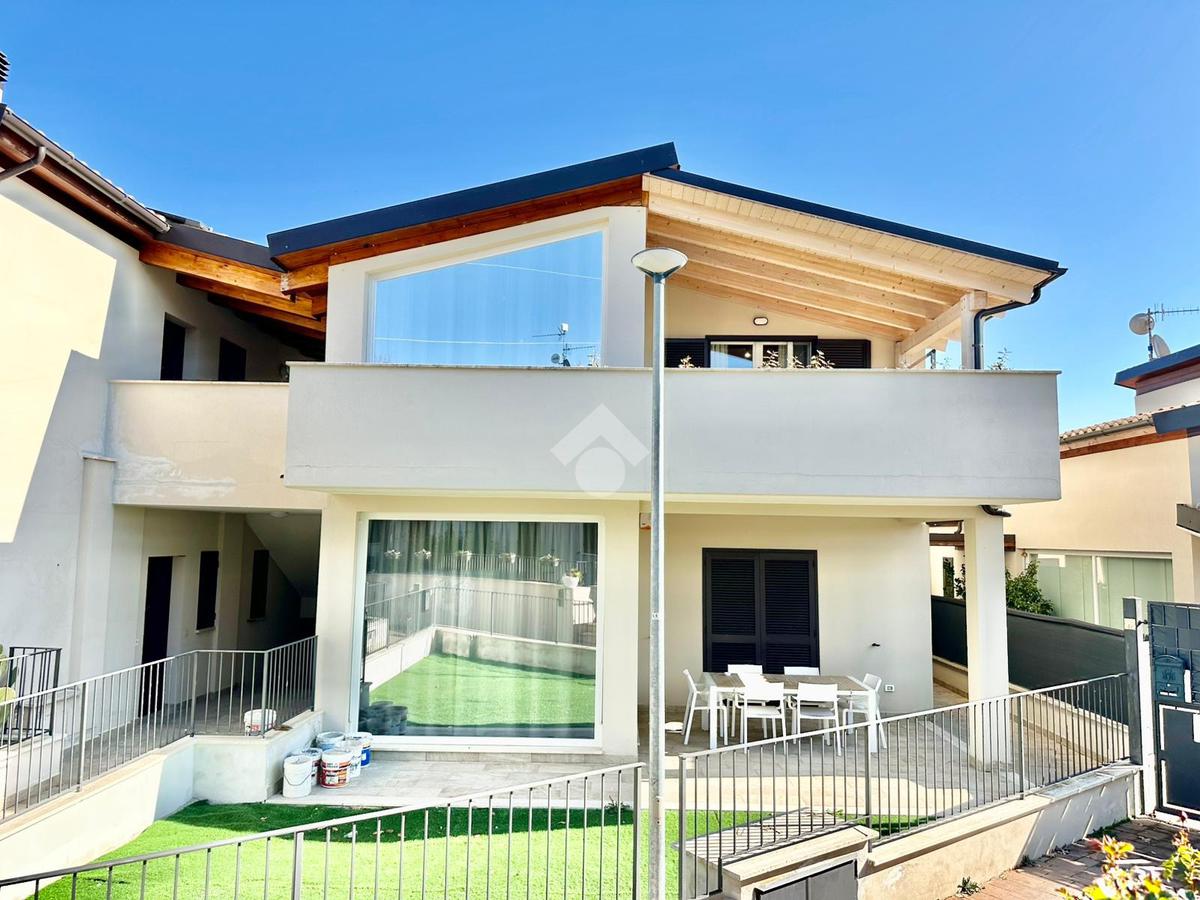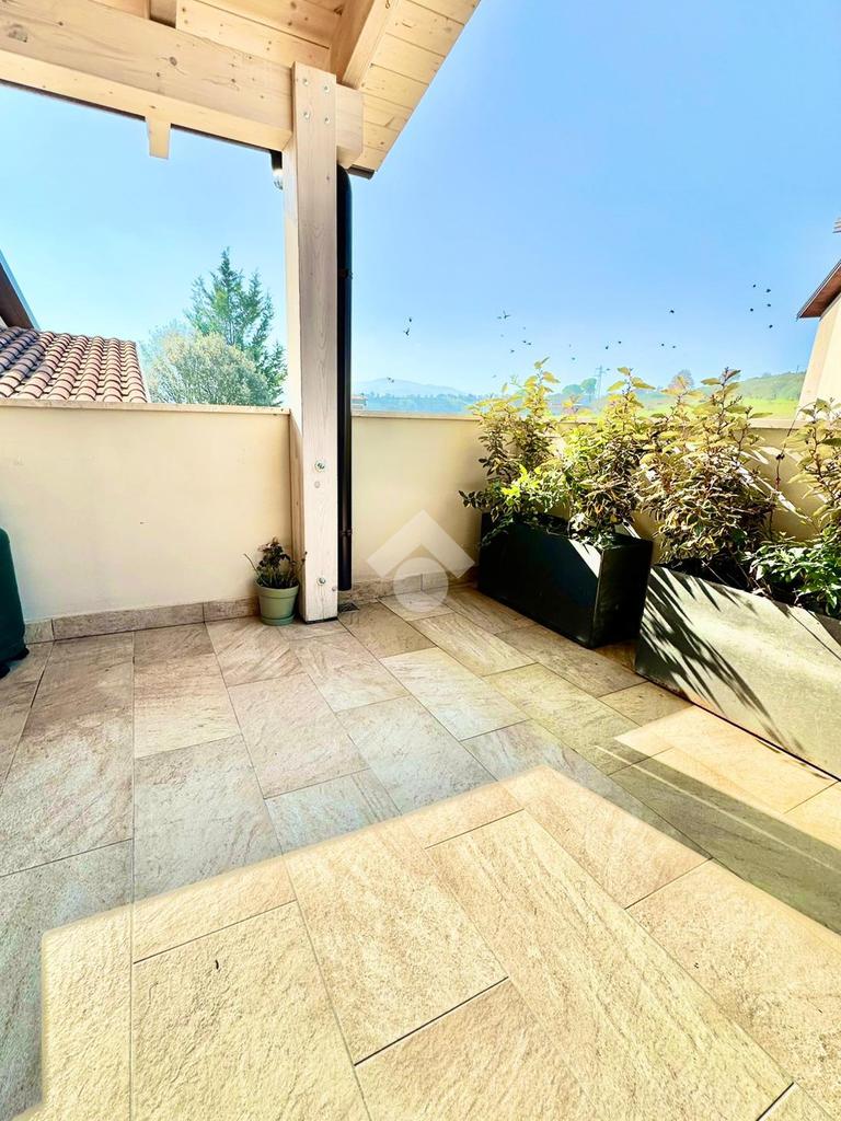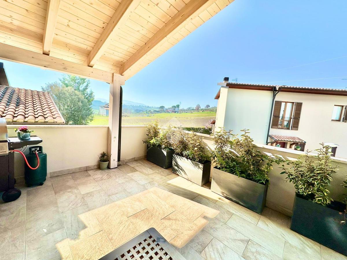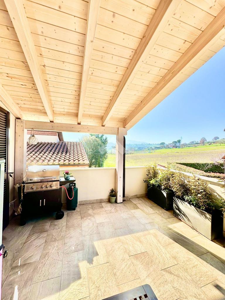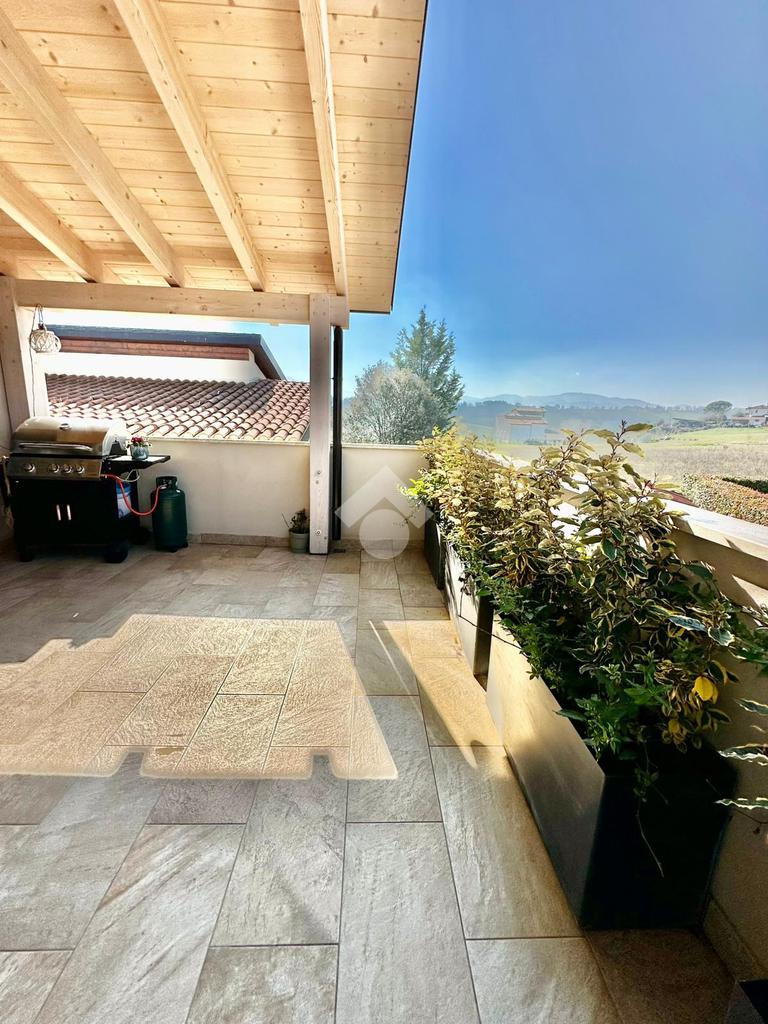 Zona San Venanzo. Porzione di bifamiliare, 5 anni di vita, posta al piano primo con ampio terrazzo abitabile. La casa è tutta in ottimo stato, sono stati usati materiali di ottima fattura, impianto di riscaldamento a pavimento, infissi di ultima generazione ed è composta da ampio soggiorno, cucina abitabile, 2 camere da letto, bagno e due terrazzi di cui uno coperto ed abitabile. Sono presenti grandi aperture vetrate che donano luminosità e panoramicità. Dispone inoltre di un garage al piano interrato. E' situata all'interno di un quartiere residenziale nuovo e curato in ogni minimo dettaglio. Nessuna spesa di condominio in quanto la casa ha ingresso indipendente e libera su 4 lati. Visionabile in qualsisasi momento.