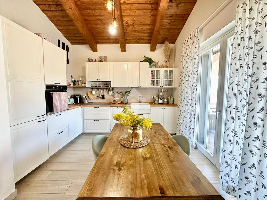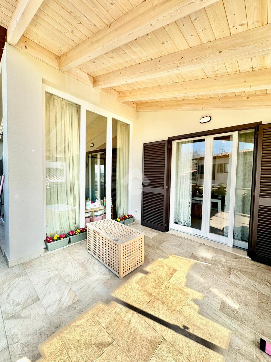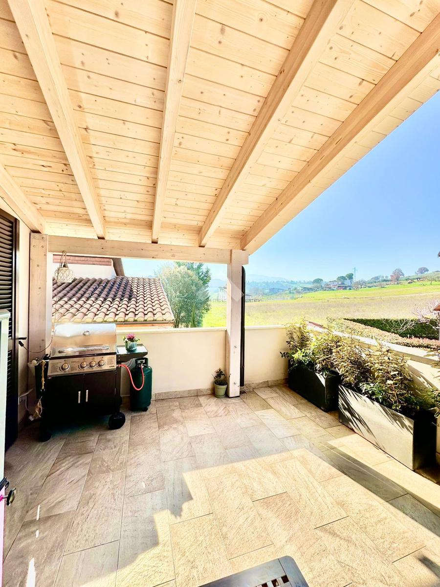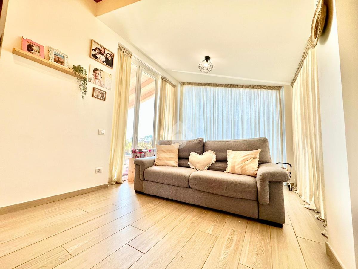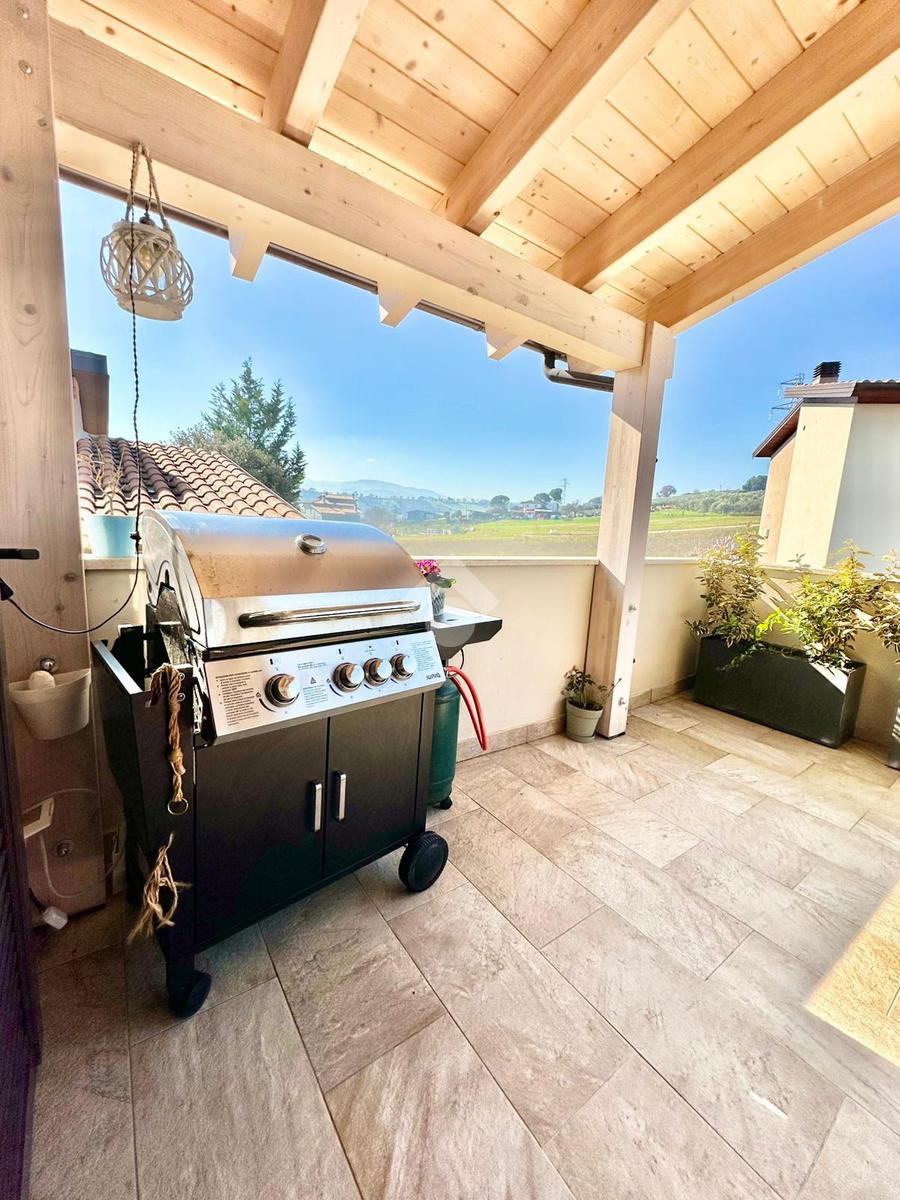 Zona San Venanzo. Porzione di bifamiliare, 5 anni di vita, posta al piano primo con ampio terrazzo abitabile. La casa è tutta in ottimo stato, sono stati usati materiali di ottima fattura, impianto di riscaldamento a pavimento, infissi di ultima generazione ed è composta da ampio soggiorno, cucina abitabile, 2 camere da letto, bagno e due terrazzi di cui uno coperto ed abitabile. Sono presenti grandi aperture vetrate che donano luminosità e panoramicità. Dispone inoltre di un garage al piano interrato. E' situata all'interno di un quartiere residenziale nuovo e curato in ogni minimo dettaglio. Nessuna spesa di condominio in quanto la casa ha ingresso indipendente e libera su 4 lati. Visionabile in qualsisasi momento.